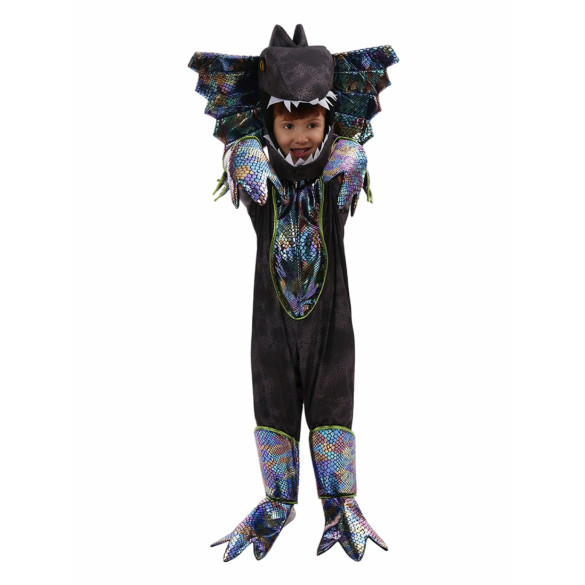 Transform your child into a fearsome Dilophosaurus with this kids black Dilophosaurus costume. This costume includes a realistic mask and jumpsuit for the ultimate cosplay experience. Let your little one unleash their inner dinosaur and roar with excitement at their next costume party.