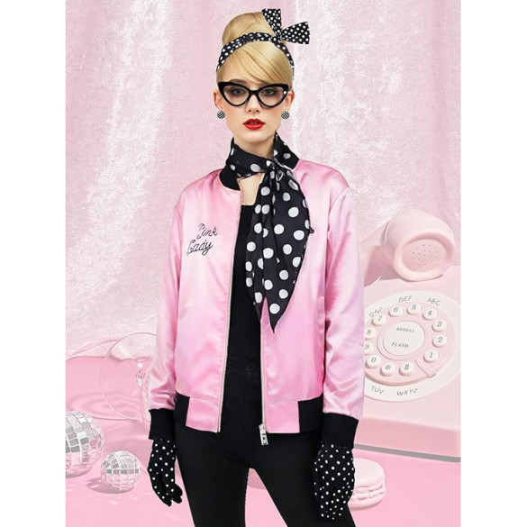 Step back in time with our Retro Pink Lady Costume, featuring a stylish pink bomber jacket that captures the essence of classic 1950s fashion. Perfect for themed parties, Halloween, or cosplay events, this eye-catching outfit will make you the center of attention. Embrace your inner greaser and channel the spirit of the Pink Ladies with this must-have retro ensemble!