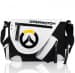 Messenger Bag made of solid cotton canvas with a big embroidered "Overwatch" logo on the flap. The messenger bag has 2 outer compartments and a pouch on the side for a smartphone or similar gadget. The inside features another zippered compartment and a split compartment with cushioning for a laptop up to 15" in size. The inside of the bag is lined with fabric that features printed icons from the game, the flap closes with magnetic buttons.