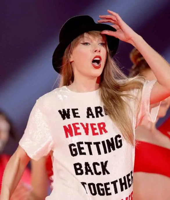 The Taylor Swift Costume is a must-have for fans of the iconic singer. Perfectly recreating her "We Are Never Getting Back Together" era tour shirt, this cosplay outfit is a stylish homage to Taylor's unforgettable moments on stage. Get ready to rock the look and show off your love for the talented pop star.