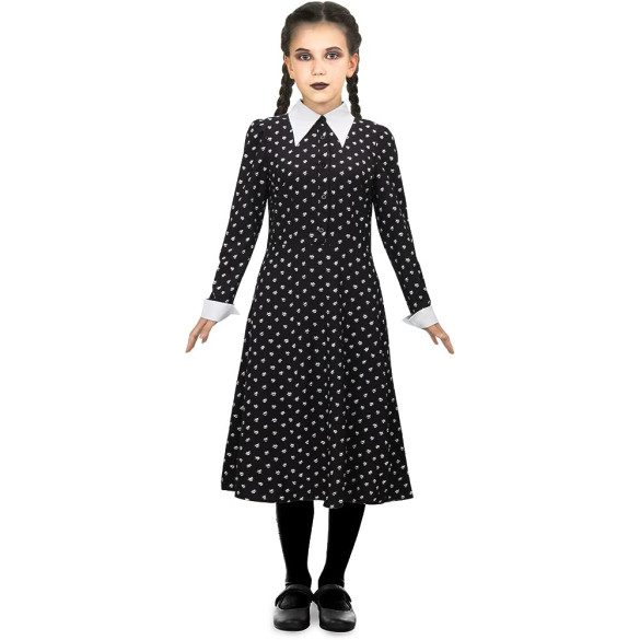 Get your little one ready for a spooky adventure with this Gothic Collar Print Dress Wednesday Addams Costume. Designed specifically for girls, this outfit is perfect for cosplay events or Halloween parties. Made with high-quality materials, this dress will bring out their inner Wednesday Addams and add a touch of eerie elegance to their look.