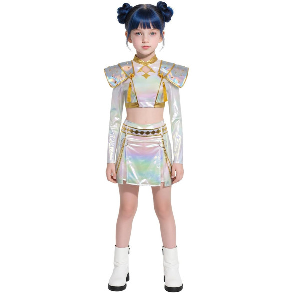 Elevate your little one's style with the KPop Demon Hunters Zoey Stage Costume, featuring a stunning shiny white skirt and top that captures the essence of KPop fashion. Perfect for cosplay events, dance performances, or themed parties, this full set ensures your child stands out with confidence and flair. Made for comfort and durability, this KPop Zoey costume is a must-have for any young fan looking to channel their inner star!